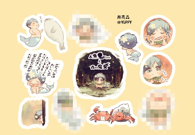 セットお買い上げの方におまけシール作ってます~ (モザイクはまだ出していない人魚ちゃん) ※イメージなのでデザイン変わるかも? #創作漫画 #人魚ちゃん