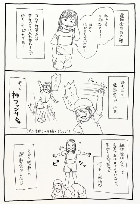 0 19 まめ運動会。 家で見るより外で見る方が大きく見えるまめ。 でも始終私たちの方を向いてぴょんぴょんファンサービスしてくれる姿は甘えん坊全開だった!!!笑 #育児漫画 22/06/07 15:34
