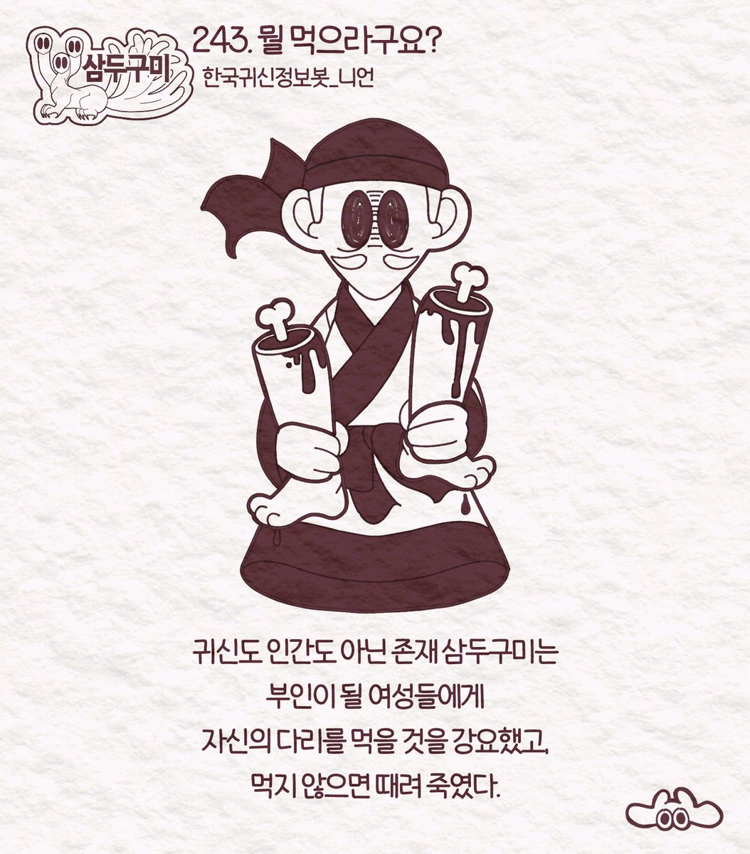 243 .귀신도 인간도 아닌 존재 삼두구미는 부인이 될 여성들에게 자신의 다리를 먹을 것을 강요했고, 먹지 않으면 때려 죽였다.