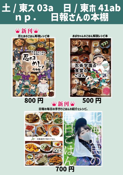 夏コミのお品書きです!忍たまの再現レシピ本と北海道ごはんのレシピ本を持って両日参加予定です。よろしくお願いいたします!! #C102お品書き #C102飲食新刊まとめ #情報評論系同人誌告知