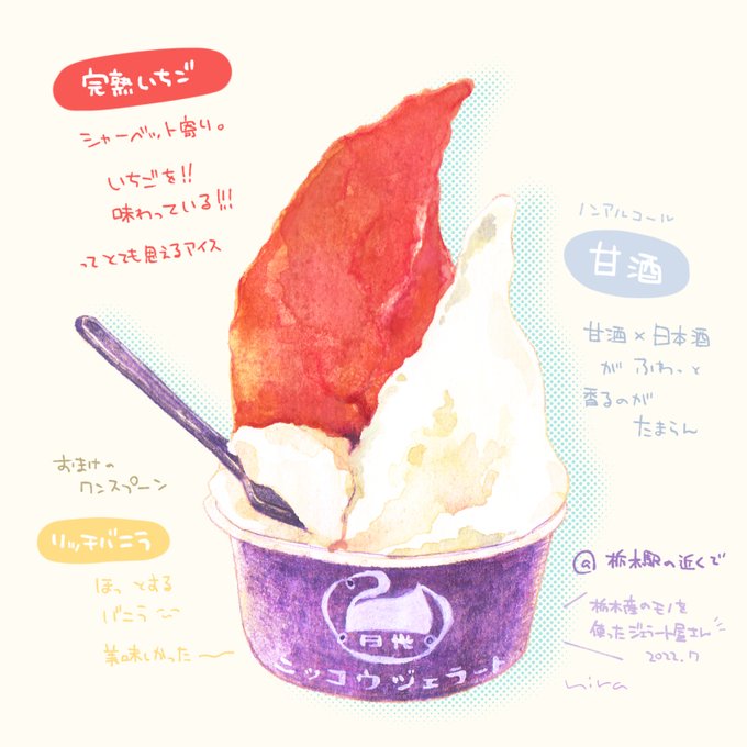 ニッコウジェラートさんの ジェラート*ダブル✨ 栃木産のものを使ったジェラート屋さん 栃木駅近くの永井百貨店内でいただきました🍧 7月の暑さでしたが、とても癒されました✨ おいしかった!^^ #イラスト #illustration #食べ物イラスト #foodillustration #ニッコウジェラート #アイスクリーム