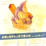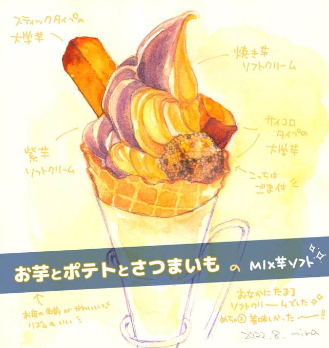 お芋とポテトとさつまいも さんの MIX芋ソフト🍠🍦✨ 焼き芋のソフトクリームがとても好みだったので、 今度は焼き芋ソフトでじっくり堪能したい//// #イラスト #食べ物イラスト #水彩 #スイーツ #ソフトクリーム #芋 #お芋とポテトとさつまいも #illust #illustration #foodillustration #sweets