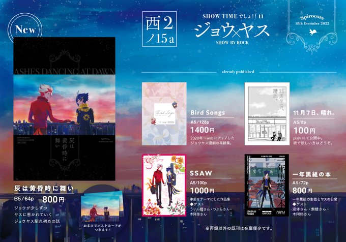 【12/18 SHOW TIME でしょ!!11おしながき】 西2ホール ノ15a spirocore ジョウヤスの本と一年黒組の本があります。 再録以外の既刊は在庫少ないです...! よろしくお願いします!! サンプルはこちらから pixiv.net/artworks/10358…