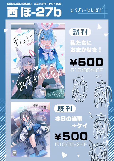 C102のお品書きです 土曜日 西 ほ-27b にて頒布します! 私たちにおまかせを! melonbooks.co.jp/detail/detail.… メロンブックス様に委託しておりますのでこちらもよろしくお願いします!
