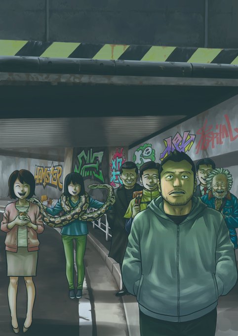 各話のタイトルに合わせたグラフィティアートに合わせて登場人物も配置したイラストも描きました。 ハムスター持ってたり、蛇持ってたり、こんな人たちが出てくる漫画です。 村田らむさん原作の人怖マンガ版『人怖 狂気が潜む人間の深淵』4/27日発売!よろしくお願いします。 amazon.co.jp/dp/4801935184