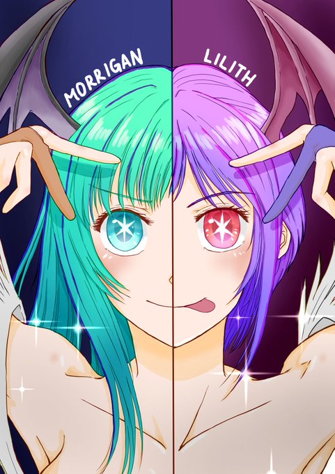 「推しの子」パロディです。 描いてみたくて勢いでつくってみました。 キャラはヴァンパイアハンターのモリガンとリリスです。ご査収ください・・・。(;´Д`) #絵描きさんフォロバ100 #格ゲーキャラ描こうぜ #推しの子