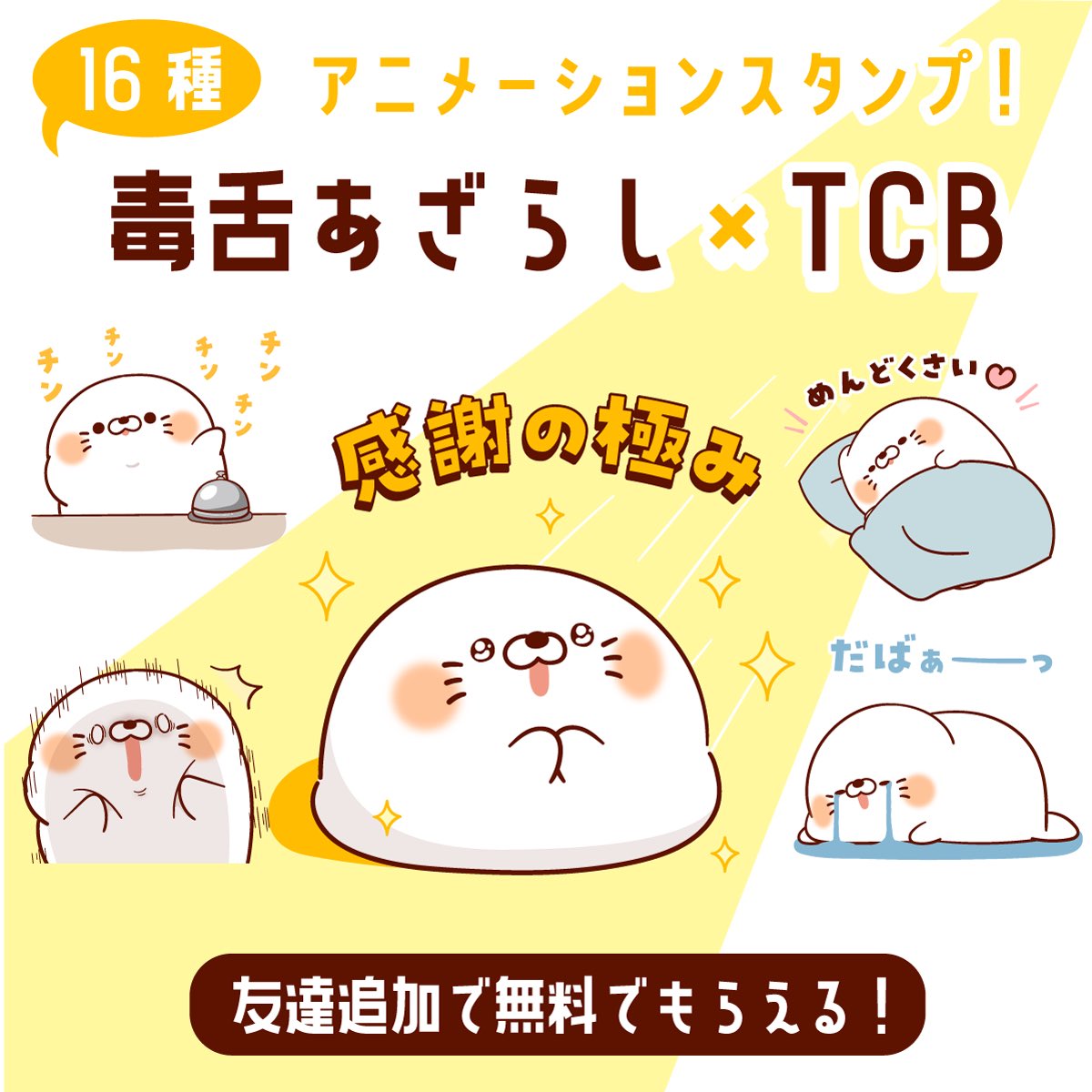 \『毒舌あざらし × TCB』 コラボスタンプ、無料配信中/ 全16種のアニメーションスタンプ! 友達追加で無料GETできます🌟 line.me/S/sticker/27753 ※配布期間:2023.5.22まで