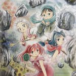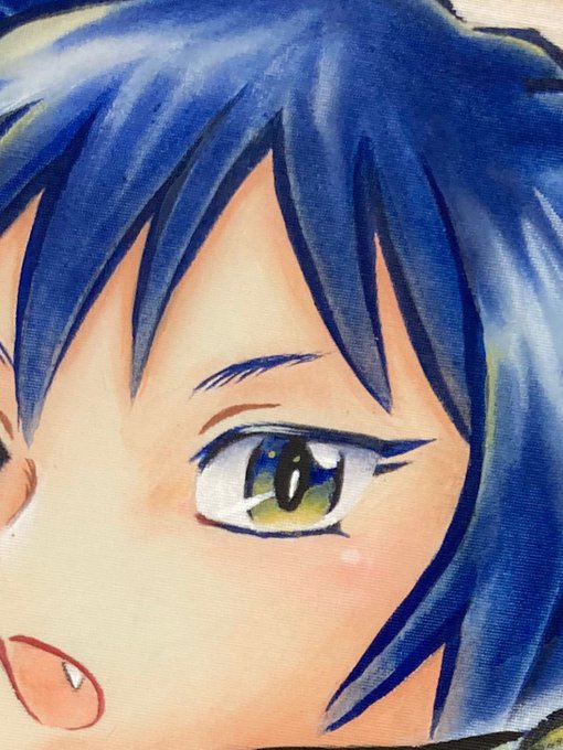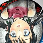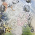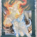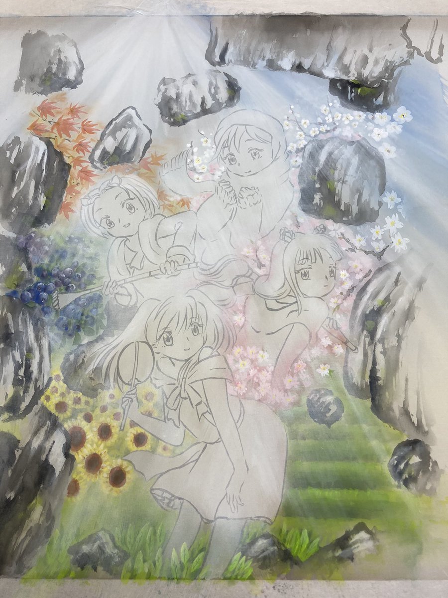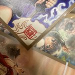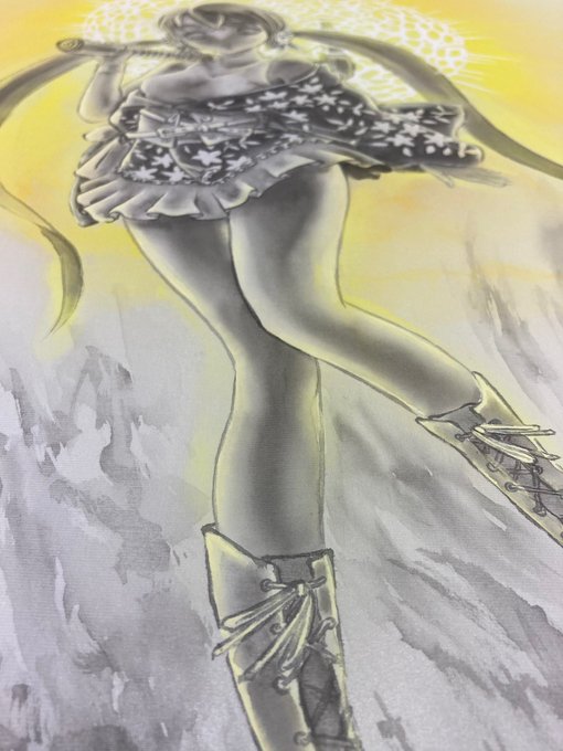 #七宗イラストアート展 私の展示作品は全てアナログ一点物肉筆原画掛軸です(´・Д・)」 どうしても図録画集やグッズ等、印刷物やデータ上では分かりづらい部分も…例えば、黒曜石末など岩絵具や、水晶末や雲母のキラキラなど… リアル展示ならでは、照明の関係で下から覗くように見て頂くのもオススメ…