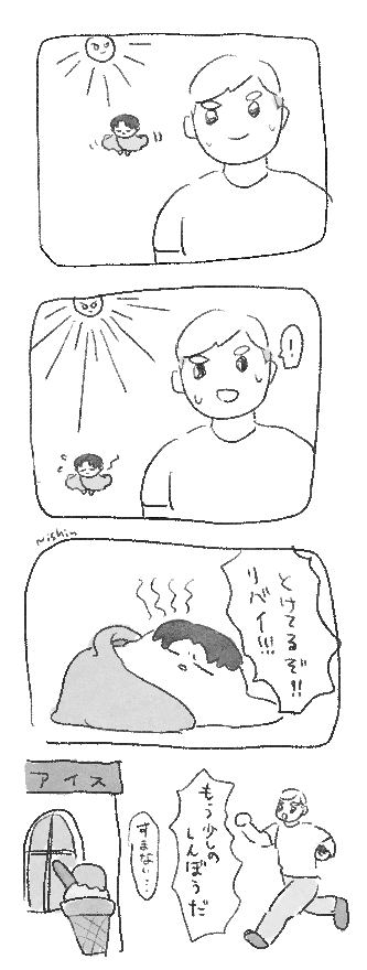 だんだん溶けていくゴロリちゃんと折り紙のお魚釣りをしてお魚がとれたぱぴり🎣✨のらくがき