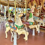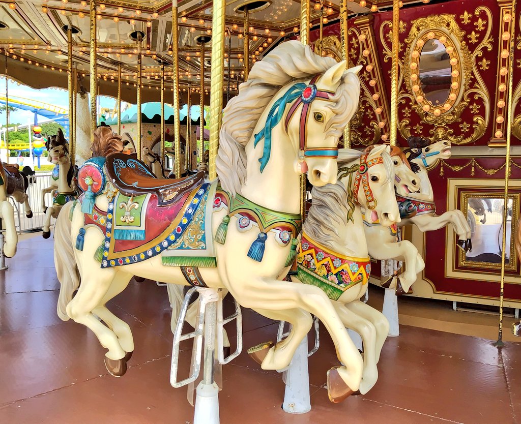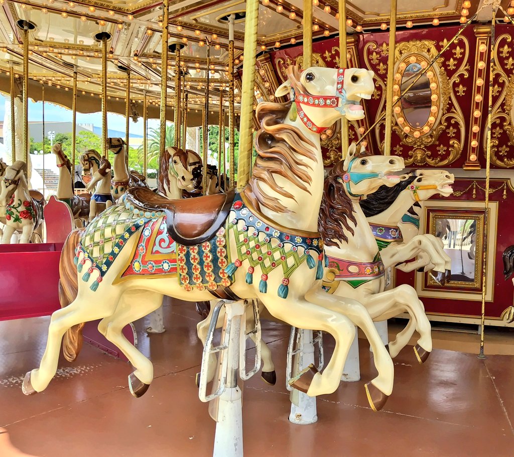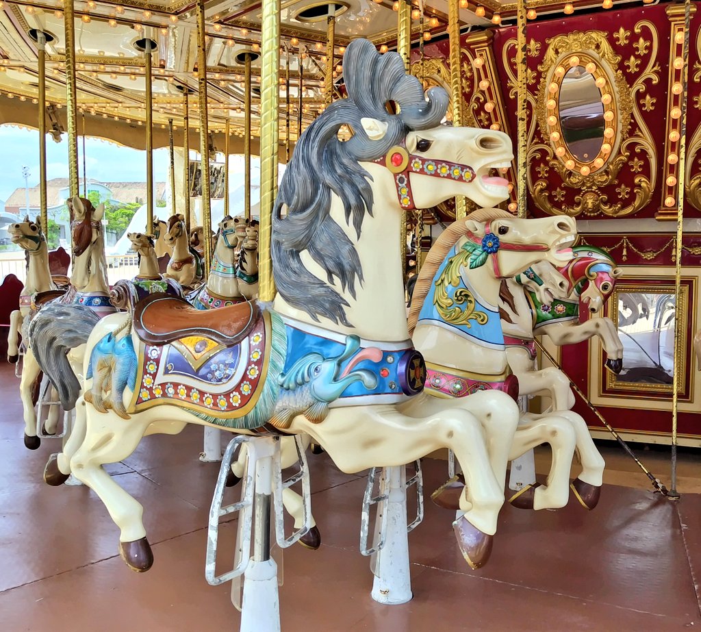 漏れなく全頭掛かってるメリーゴーランドかわいいでしょ🎠装飾もすごく凝ってる。6月に30周年になったスペイン村おめでとう。ガウディカルーセル好き✌️🐴