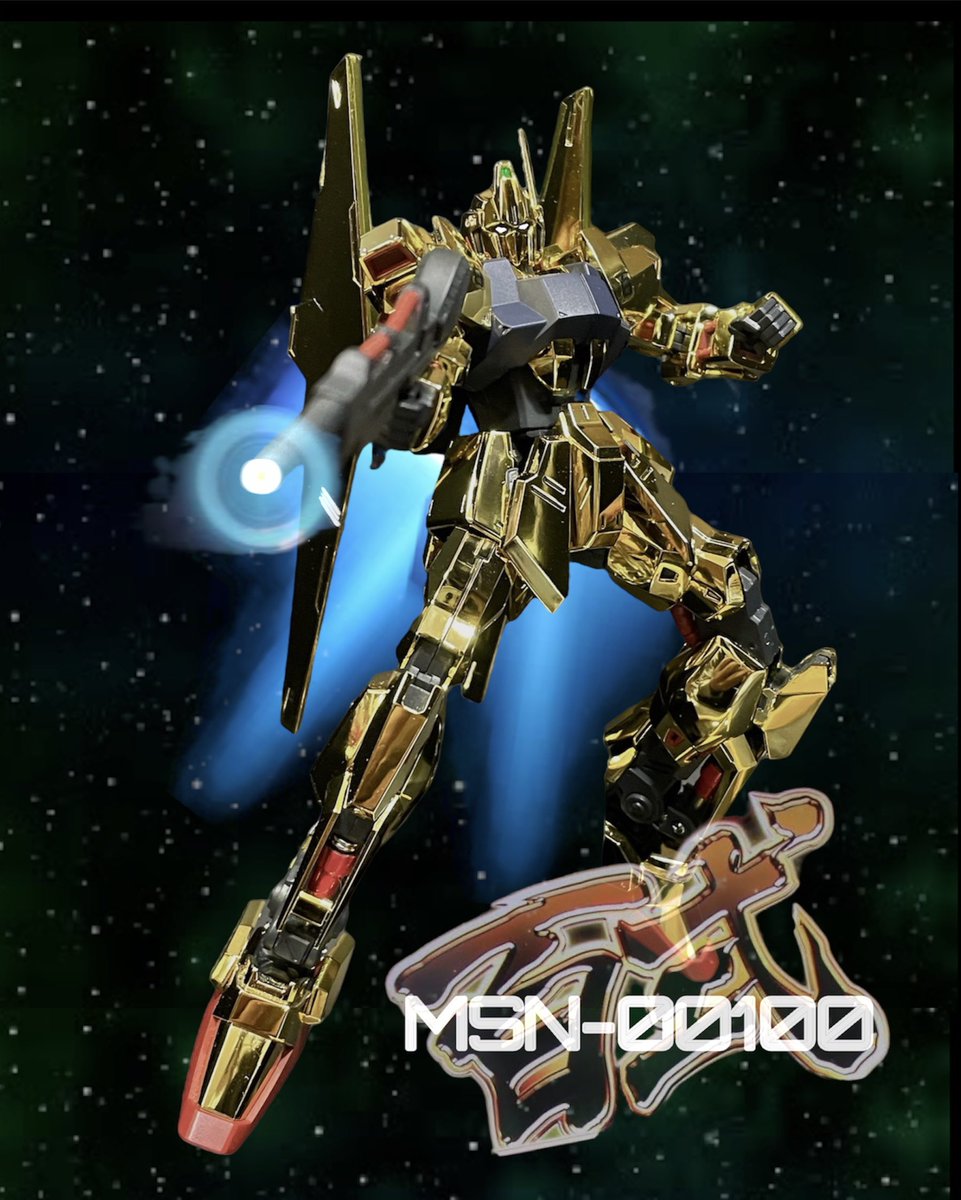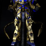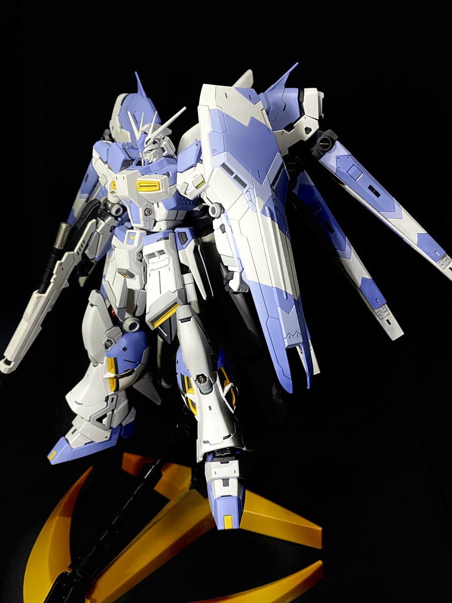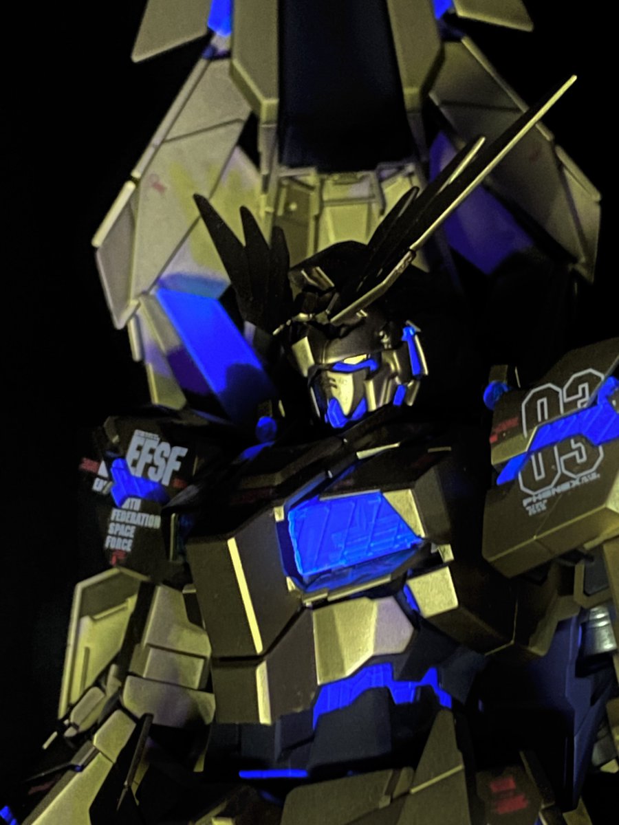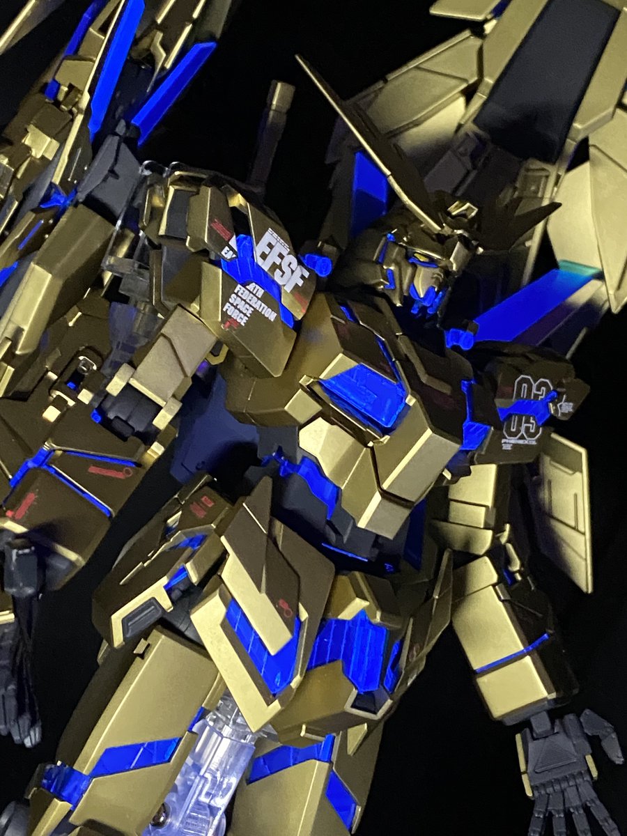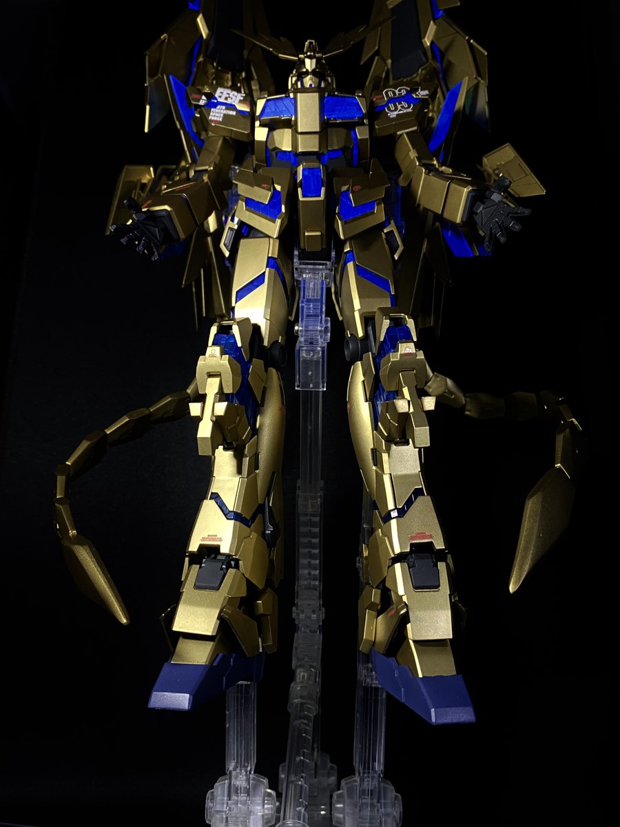 プロジェクトLa+ MGフェネクス完成。ピカピカに磨いてメタリック塗装したのですぐ色が剥がれる(^_^;)なので神降臨ポーズ&デストロイ固定でアクションベース上で作りました。最近地震多いので支柱3本!これで絶対倒れないよね〜 #ガンプラ好きと繋がりたい #ガンプラ #ユニコーンガンダム #MGフェネクス