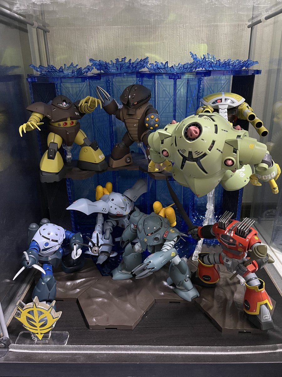 水泳部祭りが終わり、また一段ディスプレイが完成しました。テーマは「ジオン水泳部の部室」。ゾックはポージング苦手なので泳がせましたwおかげでジュアッグさんは目立たなくて、かわいそうですね。 #ガンプラ #ガンプラ好きと繋がりたい #ジオン水泳部