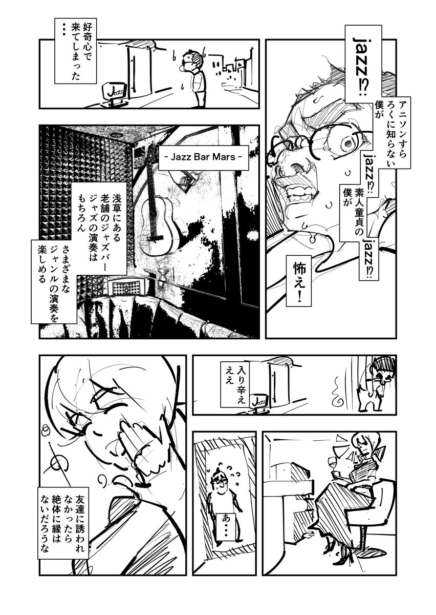 6 41 友達に誘われてジャズバー行ってきました。 うーむ、かっこいい #漫画が読めるハッシュタグ #創作漫画 #ジャズ #JAZZBARMARS 21/12/13 06:43