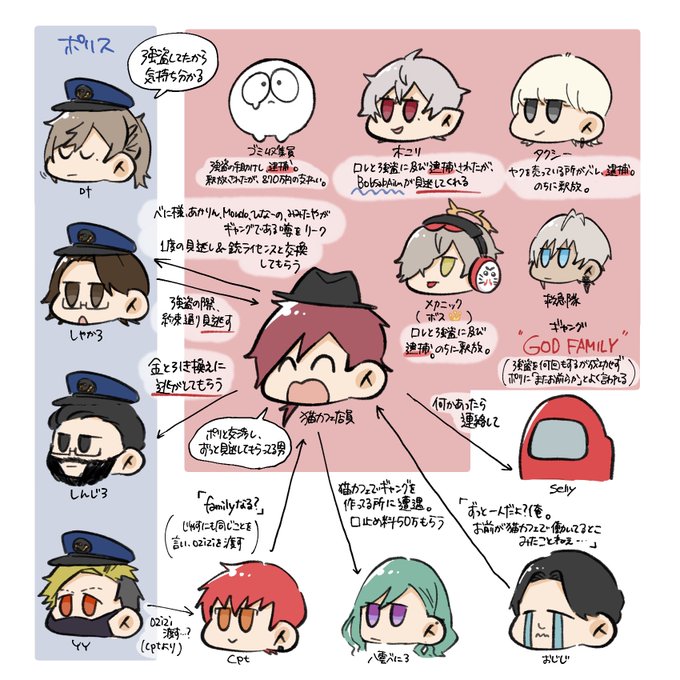 ローレン中心視点 VCRGTA相関図&銀行強盗事件詳細 現在(配信終了後時点) 銀行強盗事件詳細 (黒:ロレ枠時間、青:釈迦3枠時間、赤:👼枠時間) 黄色下線→ポリとGODでリンクしてるところ ⚠️ネタバレ大量に有 #VCRGTA