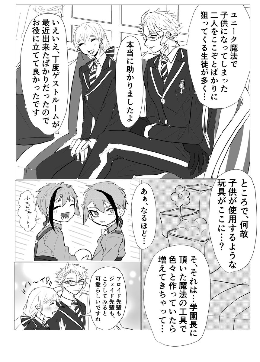 219 3509 #twstプラス ご都合ユニ魔で子供になっちゃったリーチと監督生とアズール 🐙監♀寄の🐚監♀ ※顔有監♀ (1/2) 22/06/25 04:28