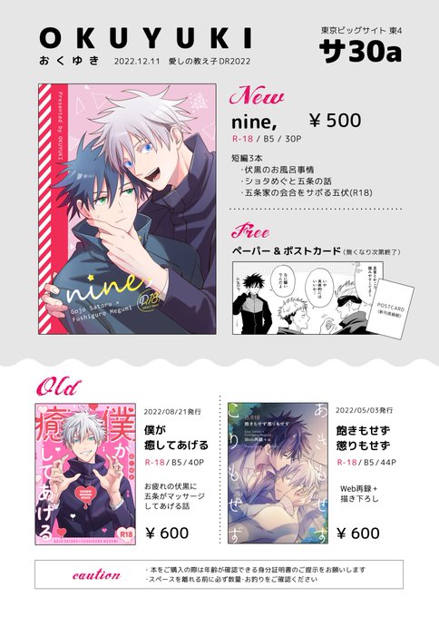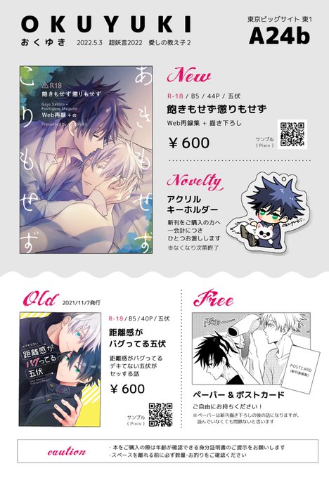【5/3 お品書き】 超妖言2022 愛しの教え子2(五伏) 東京ビッグサイト 東1 A24b [ おくゆき ] Pixivお品書き:pixiv.net/artworks/97919… 新刊:pixiv.net/artworks/97717… 既刊:pixiv.net/artworks/93482… 当日はよろしくお願いします!