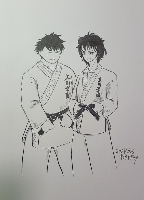 #チャンピオン版深夜の真剣お絵描き60分一本勝負 お題:第279回テーマ「頂点に立ったキャラ」 「もういっぽん!」から立川学園・榊原と冨士森。 身長差分からんかったけど、榊原背が高い気がしたので、同じくらいかなあ。