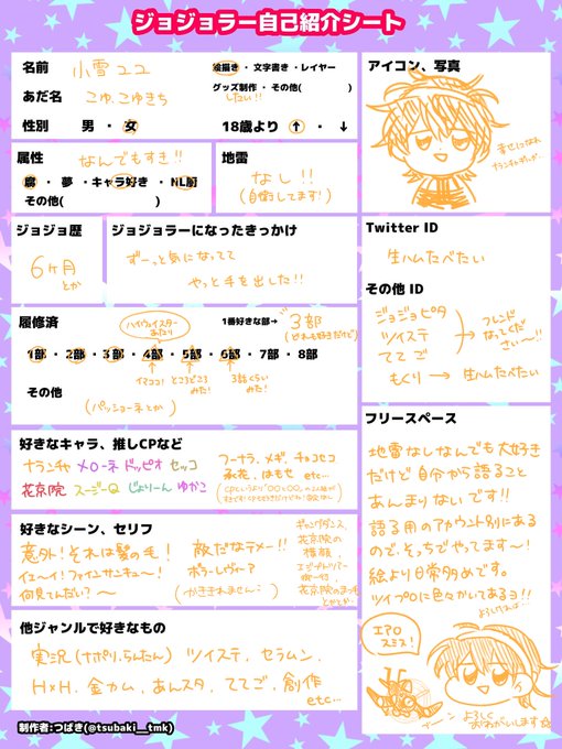 #ジョジョラーさんと繋がりたい #ジョジョ好きさんと繋がりたい #ジョジョラー自己紹介シート 絵柄が安定しない雑多アカです! RTorふぁぼ気になった方無言フォロー失礼します🙇♀️よろしくお願いします💖💖🍊