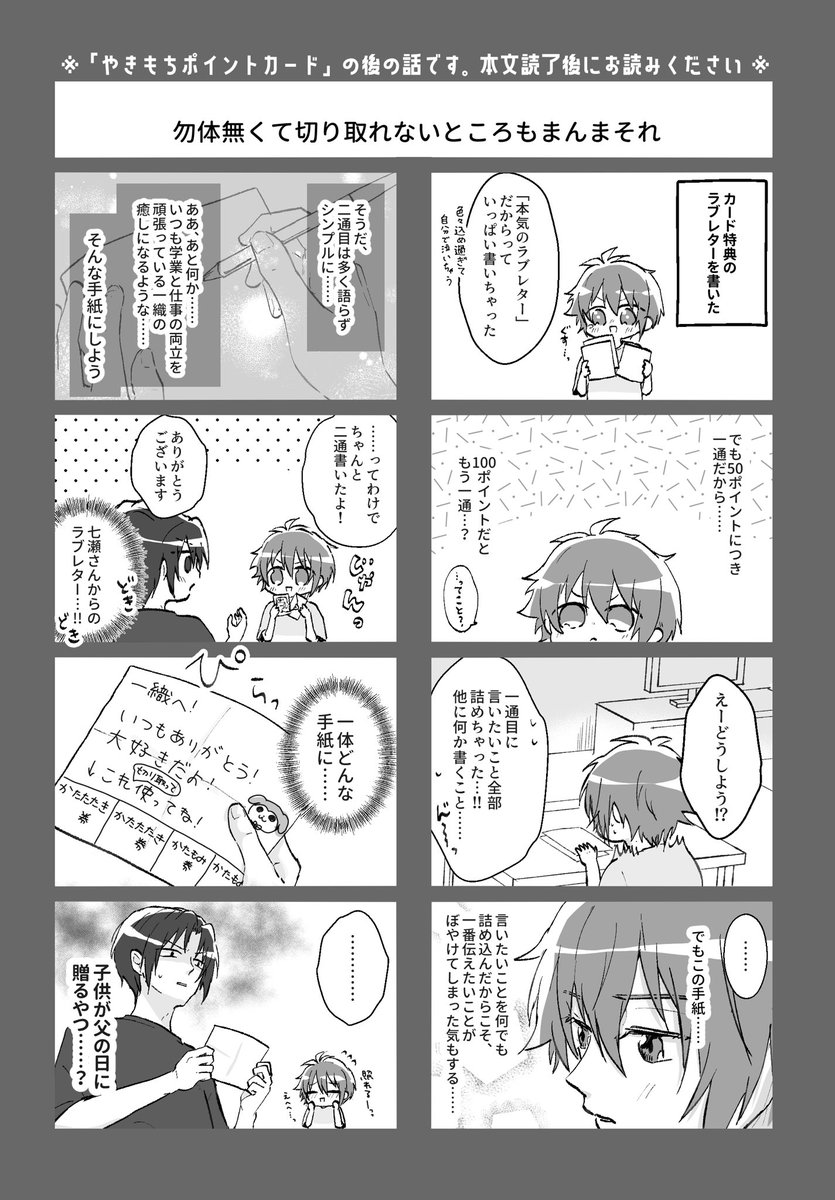 通販もぼちぼち届いているようなので、6/25の無配です🙌 「やきもちポイントカード」の後日談なので、本をお持ちの方・これから届く方は本文読了後にお読みください🙇♀️ 本をお持ちでない方もサンプル(pixiv.net/artworks/10906…)を見れば大体内容は分かるかと思いますので雰囲気でお楽しみください…🐰🍓