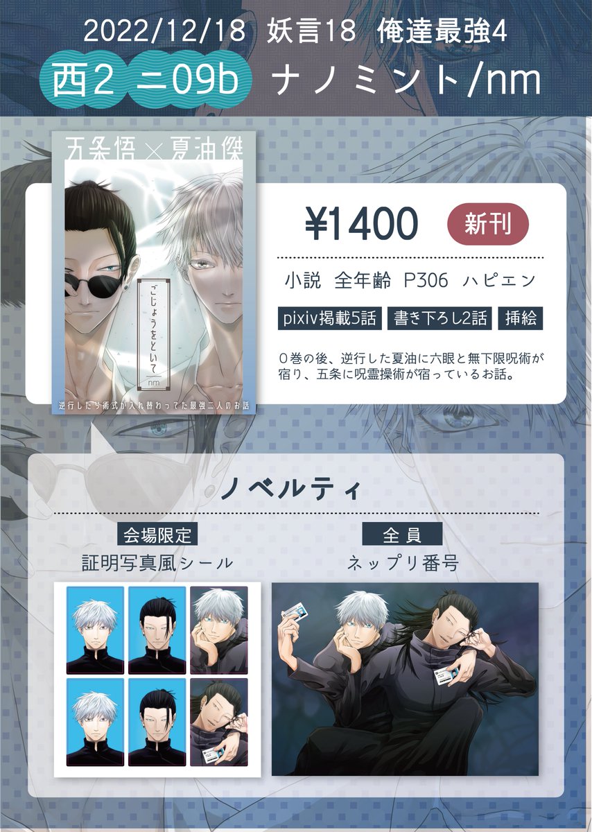 【お品書き】12/18 妖言18 俺達最強4 逆行したら術■式が入れ替わってた最強二人のお話 A5/P306/1400円(会場価格)/ハピエン ◆お品書き pixiv.net/artworks/10351… ◆とらのあな様 ecs.toranoana.jp/joshi/ec/item/…