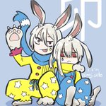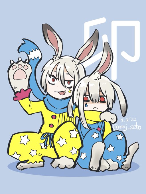 4 37 #人外版深夜の真剣お絵描き60分一本勝負 お題「アナタが好きな干支をモチーフにした人外」より卯年を! 双子で道化師なウサギさんです🐰 21/01/03 00:13