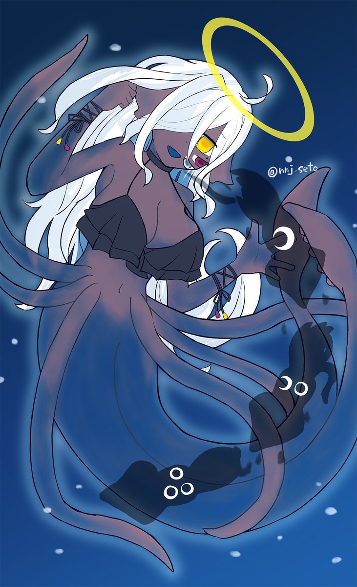 #人外版深夜の真剣お絵描き60分一本勝負 遅刻すみません! お題「アナタが考える環礁で会えそうな人外」いただきました ハナイカ人魚ちゃん🦑🧜♂️