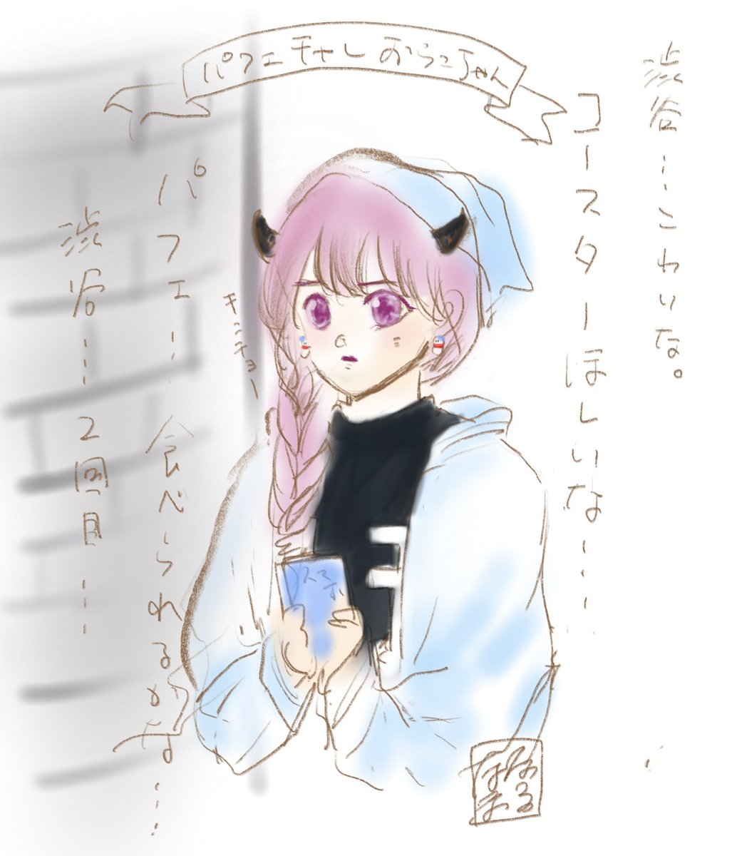 1日1落書き。 おらこちゃんパフェチャレンジ。 渋谷は2回目、1回目はぼんさんエスコート…心強かったな… #見るかもわからん #ドズル社アート