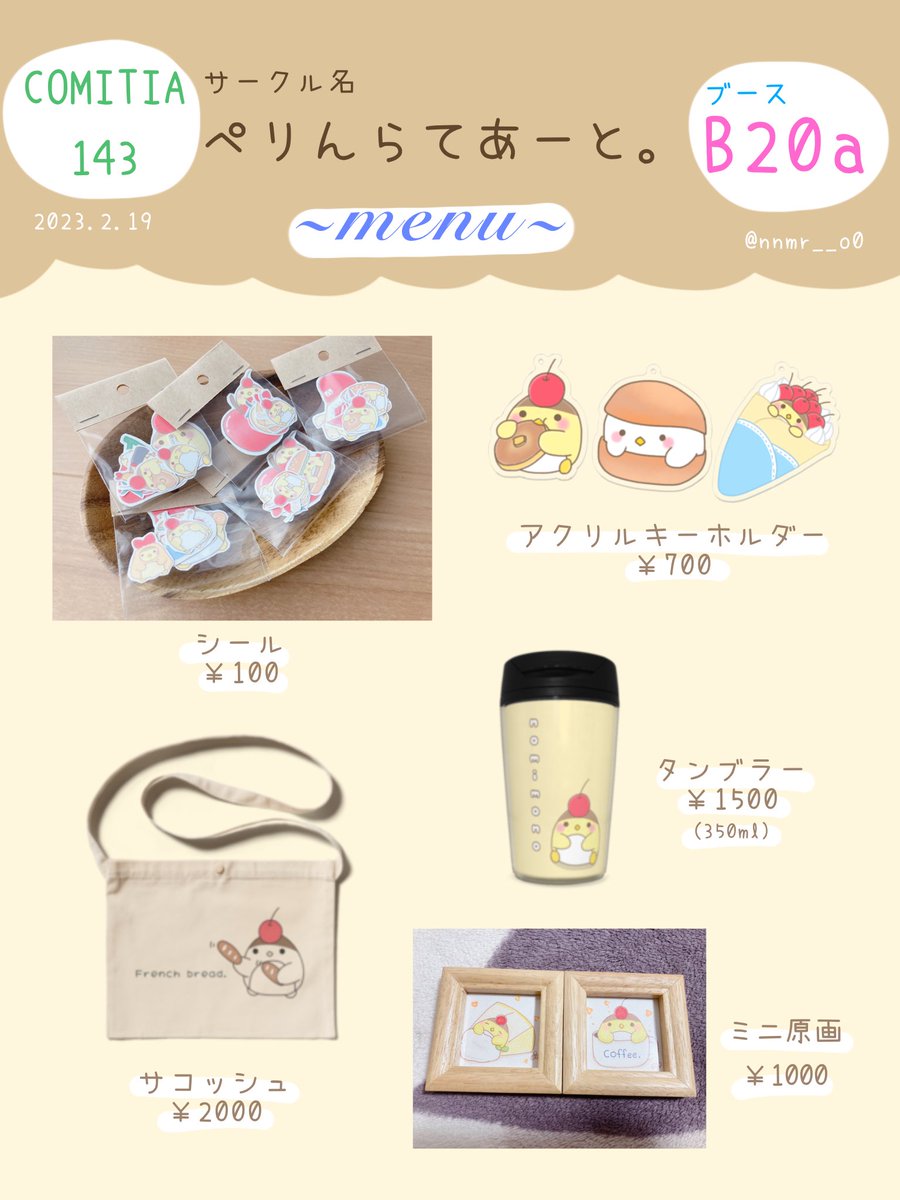 2/19(日)コミティアのお品書きです。🍮🍒 イラスト本をはじめ、たくさんのグッズ販売いたします。 よろしくお願いいたします🙏✨ #COMITIA143 #コミティア143