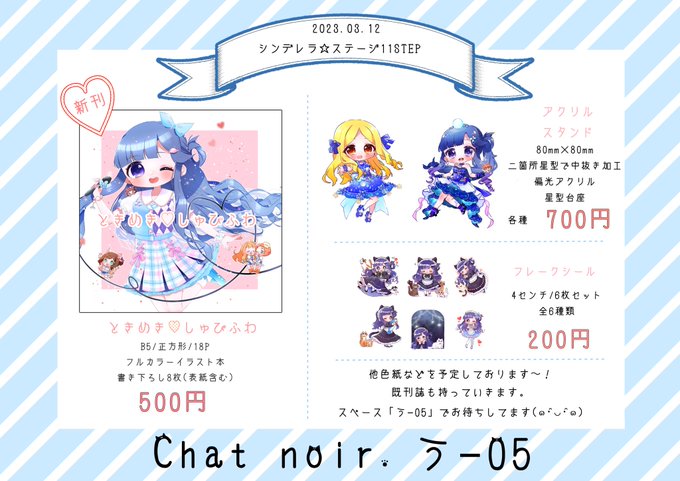 3月12日のシンステ11のお品書きです! 新刊イラスト本とアクスタとシールと既刊誌、グッズ持っていきます〜! イラスト本サンプルは画像2枚目でご確認ください。 スペース「う−05」よろしくお願いします🐈⬛ #cin_stage
