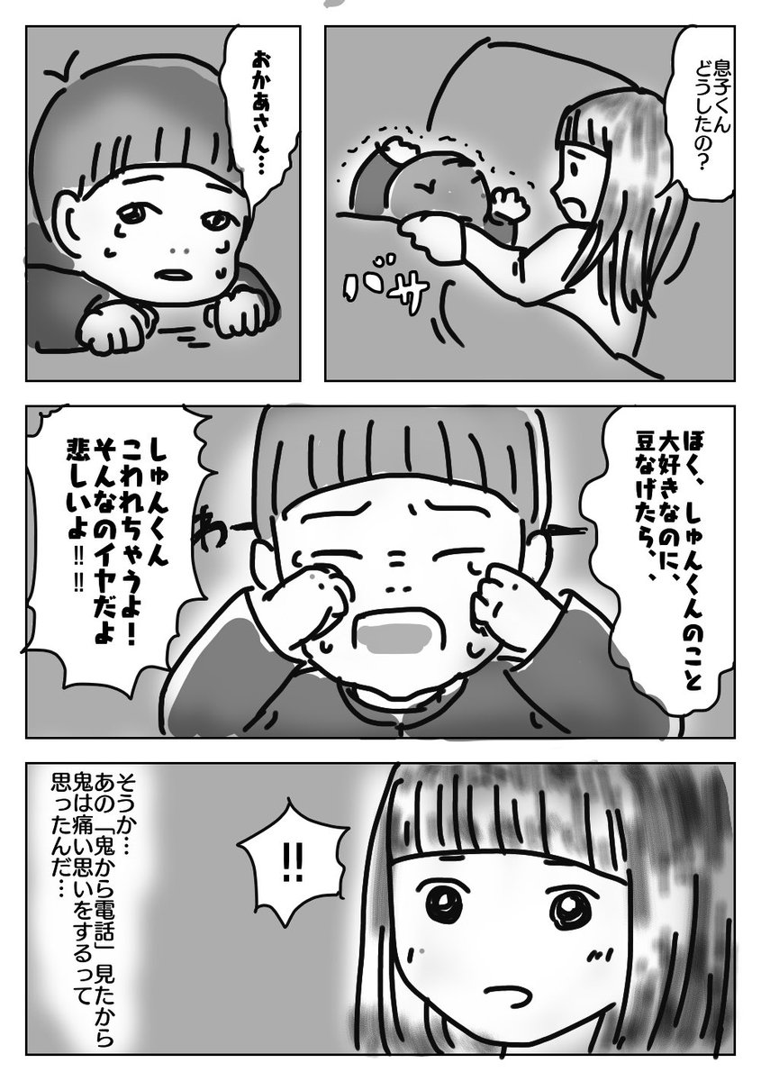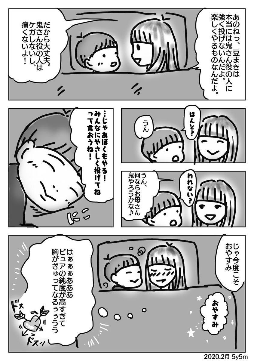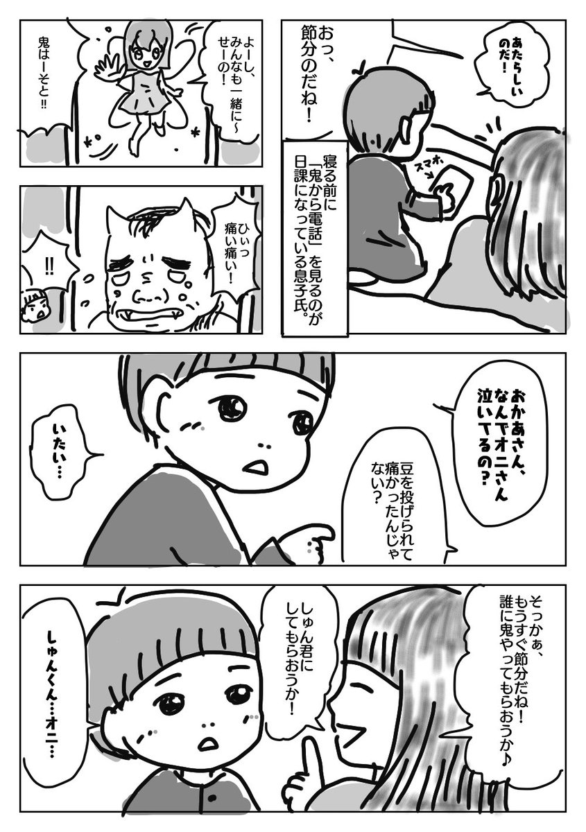 1 8 何とか今日に間に合った! 息子氏がピュア過ぎてやさし過ぎて胸がキューッとなった話。 言葉などをそっくりそのまま受け取るのはASDの特性かも。 (※しゅん君は私の弟:息子氏の叔父です) #育児漫画 #徒然育児絵 #ののぱ育児記録 #息子氏はピースフル大使 #節分 #ASD 20/02/03 23:44