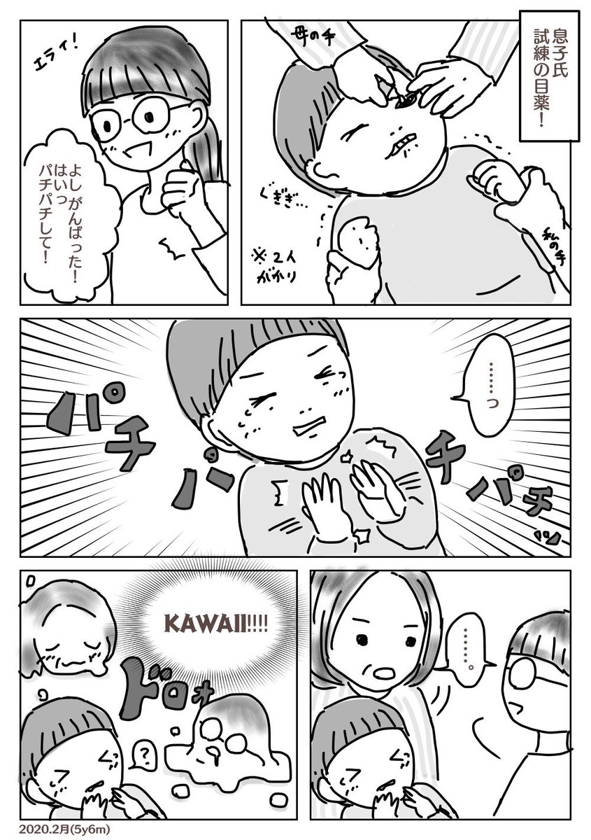 1 6 下書きしたまま時間に追われ放置してたけど見直したらやっぱり可愛かったので仕上げた。 (※点眼後パチパチは誤りらしいので、息子氏の方が正しかったです) #ののぱ育児記録 #育児漫画 #徒然育児絵 20/05/01 08:46