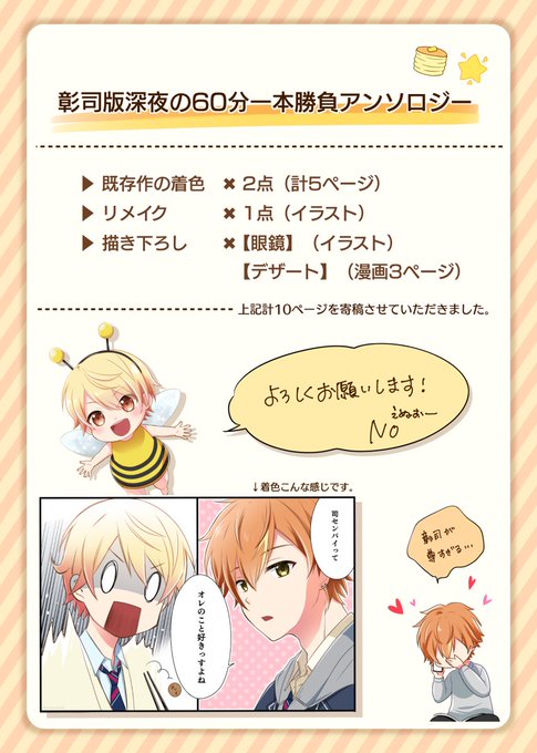 #彰司版深夜の60分一本勝負アンソロジー 彰司ワンドロアンソロジー企画に寄稿させていただきました。 ▶︎既存作の着色:2点 ▶︎リメイク:1点 ▶︎描き下ろし:2点 計10Pです。宜しくお願い致します🙇♀️ 1冊まるまるどこを見ても彰司だらけの本…とても楽しみです☺️