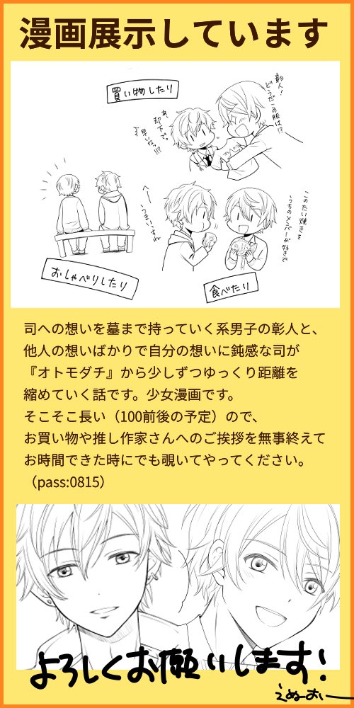 8/28開催彰司🥞🌟WEBオンリーのサクカ&お品書きと展示漫画のサンプルです。(1/3) エアスケブは当日マロ、リプ、ボード等でリクいただければ描かせていただきます(キャラ単品、2人の場合は🥞🌟のみ) ネプリは既存絵を登録するか悩み中です。 どうぞ宜しくお願い致します🙇♀️ #あきらめがつかない