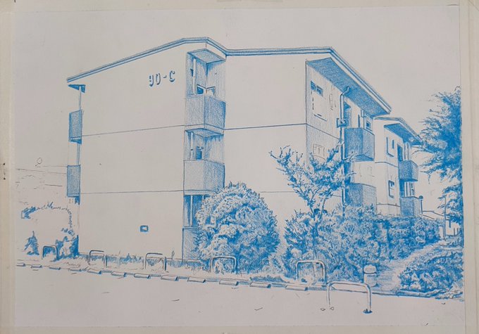 団地の風景 A4サイズ。 1色目のシアン(青)は ひとまずこのくらいにして 次はマゼンタ(赤)に行きます😁 #色鉛筆画 #団地展