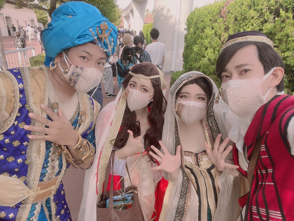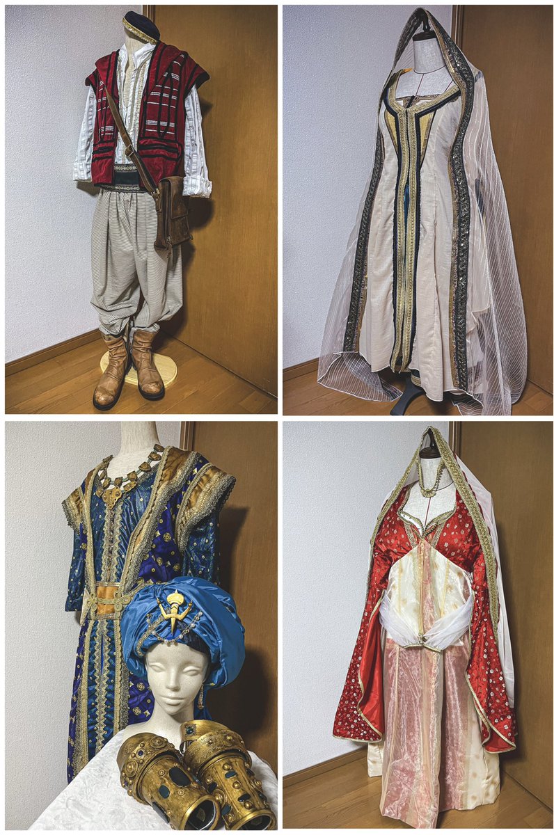お手伝いさせてもらったジーニーとダリアさんの衣装✨ この2着は既製品の改造なのでベースをバラして装飾付けたりサイズの調整等をさせてもらいました🪡 ジーニーの装飾@pasta_al_dente 4着並べるととてもアグラバー🧞 #Dハロ仮装2022 twitter.com/nodame_disney/…