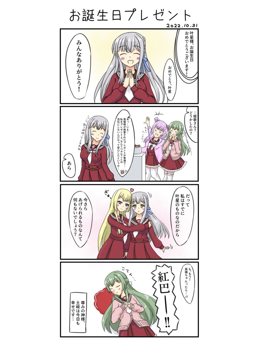 この叶星様お誕生日記念に描いた4コマ、ぶっちゃけ3コマ目が描きたいだけで描いたのでラスバレで似たこと言い出してとっきーと一緒に悶えてました。ていうか今回のイベントの叶星様やけに飛ばし気味で無邪気で可愛かったな…。 #アサルトリリィ #アサルトリリィ_FA #ラスバレ