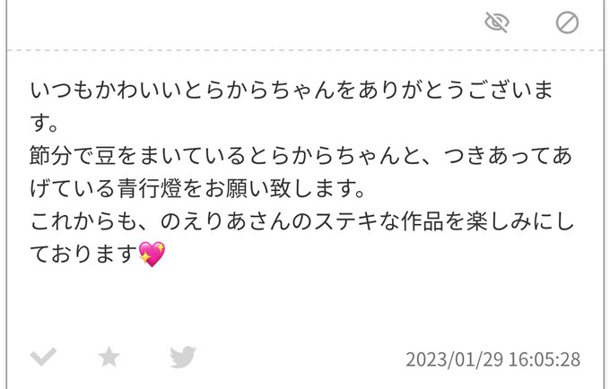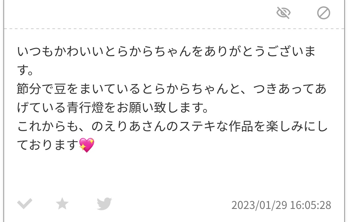67 224 #odaibako_noelia_matsu odaibako.net/detail/request… お題リクエストありがとうございます!節分青行燈ととら達描かせていただきました✨ 23/02/03 22:57