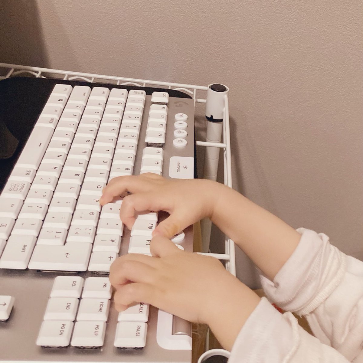 たくさんおもちゃがある中、棚に置いてあるキーボードを注意してもずっとカチャカチャ触り続けるので、2代目草の人としての自覚が早くも生まれている可能性があります。