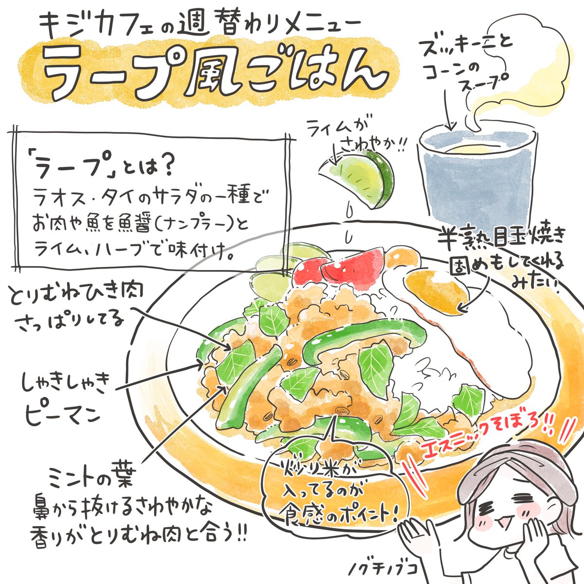 3 18 キジカフェのラープ風ごはんがあまりにツボだったのでイラストにしました🍳自分で作ろうと思ってさっそくナンプラー買ってきましたよ。 #食べ物イラスト #イラストレーター 23/07/15 18:59