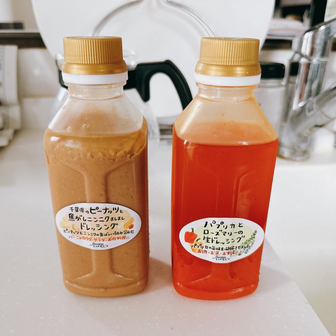 4 19 【ドレッシングのラベルを描きました】 流山市の運河にあるフレンチレストラン・ブラッスリーしんかわ様のオリジナルドレッシングのラベルを制作しました。 🥜千葉県のピーナッツと焦がしニンニクましましドレッシング🧄 🫑パプリカとローズマリーの生ドレッシング🌿 店頭の冷蔵ケースで販売中! 23/08/03 19:26