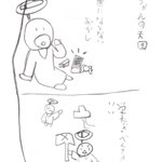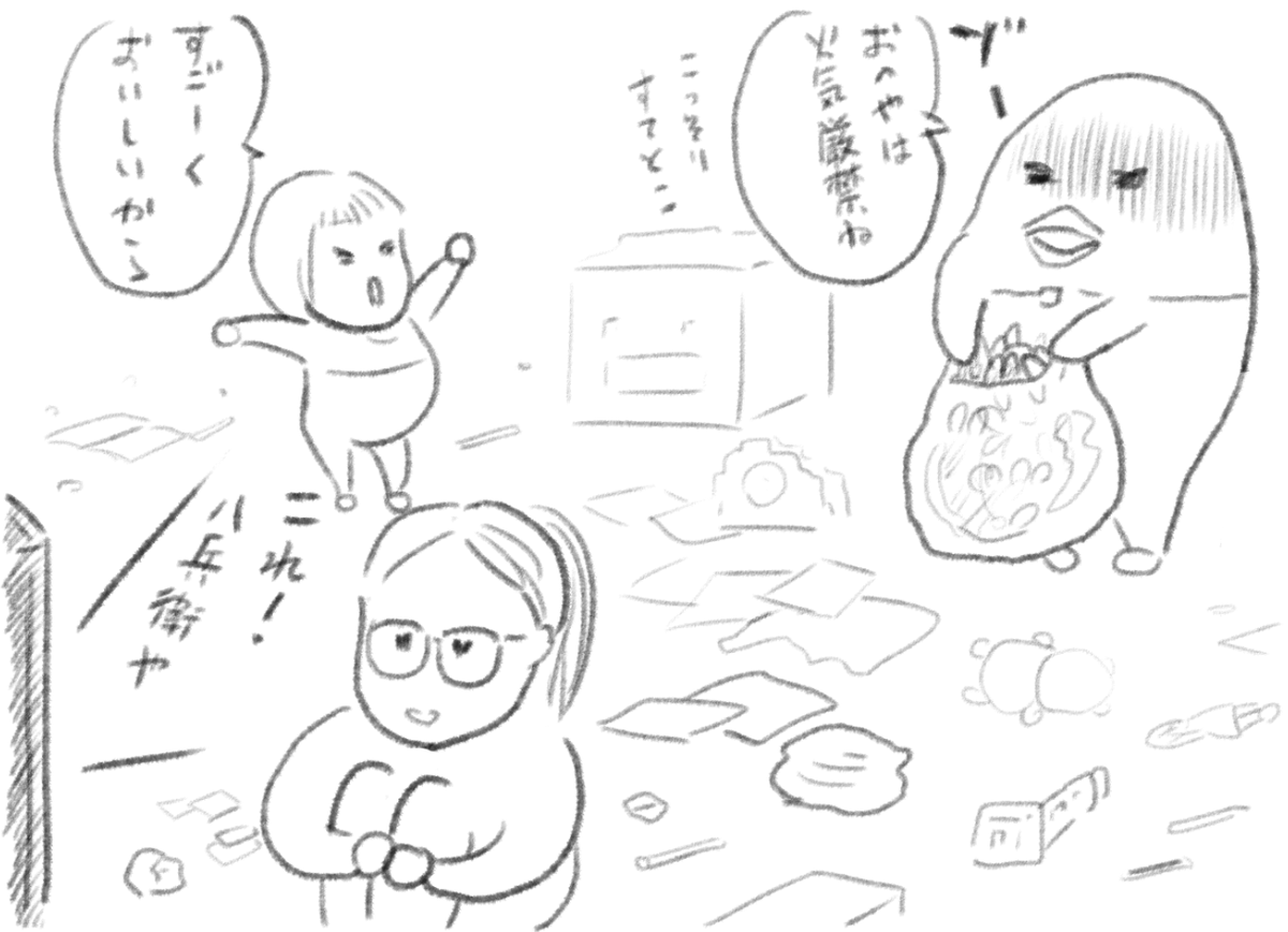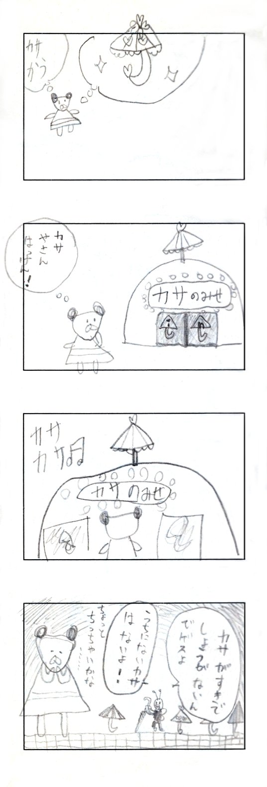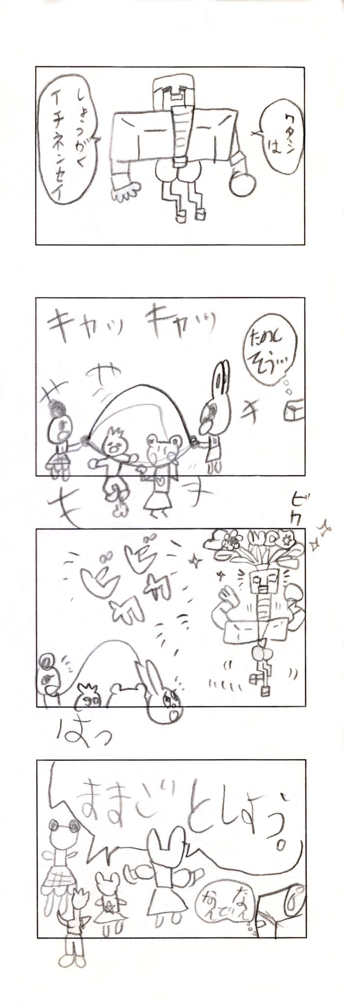 娘との共作4コマ漫画 その3 娘が年長さんの時に1コマずつリレー。娘は1コマ目と3コマ目、カミさんが2コマ目と4コマ目を担当。 #創作漫画 #4コママンガ #漫画が読めるハッシュタグ #絵描きさんと繋がりたい #育児漫画