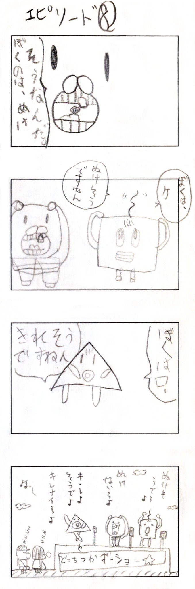 娘との共作8コマ漫画 その1 9才長女と8コマ漫画をリレーして描いたよ。長女は2コマ目と4コマ目、6コマ目、8コマ目を担当。 #創作漫画 #4コママンガ #漫画が読めるハッシュタグ #絵描きさんと繋がりたい #育児漫画