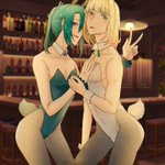 兎年もかねてバニー晴明&夕魔 ウェイターの仕事中。 あ!よろずやはそういうお店じゃないのですよ。誤解です。 夕魔と晴明の関係性は……今は話せないですね(先走り) #たそ月イラスト