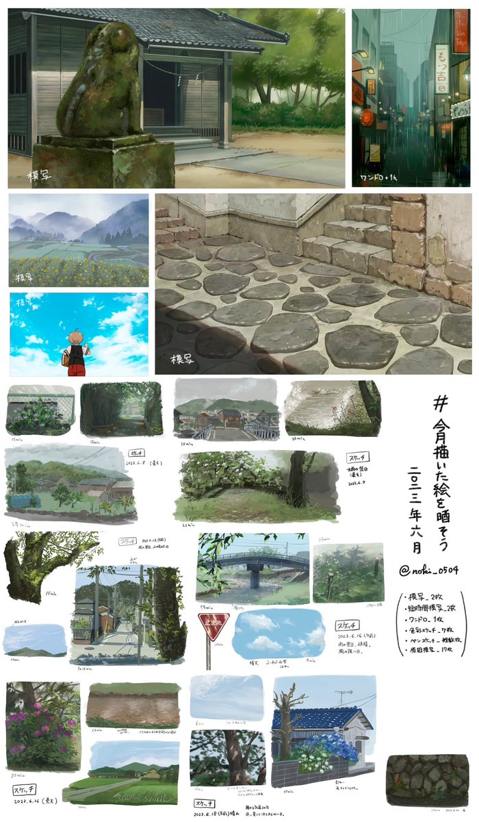 60 538 #今月描いたイラストを晒そう 6月分です。色彩スケッチが楽しかったみたい。梅雨時期にしては頑張ってた方かなぁ。 23/06/30 21:50