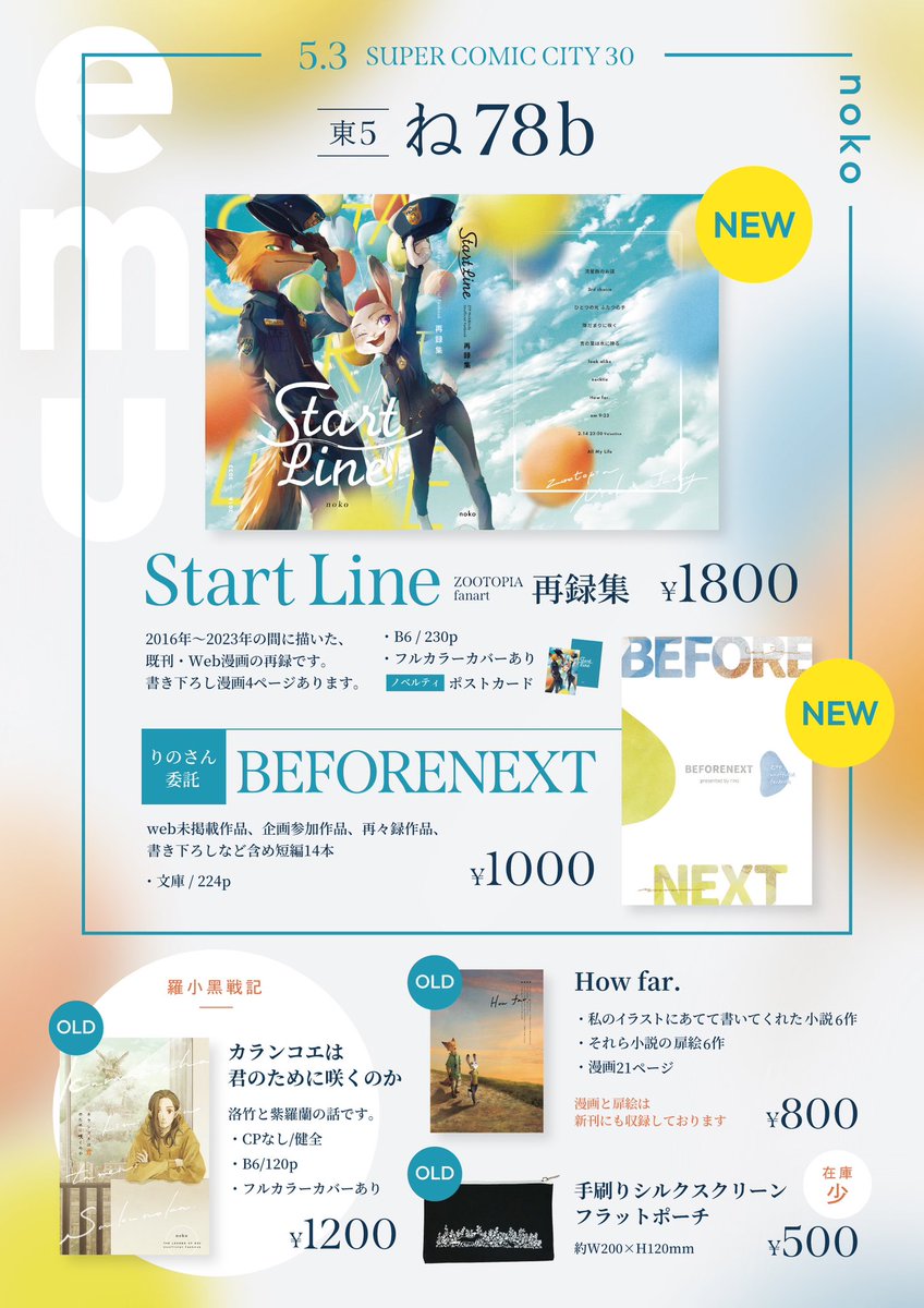 🐰🦊5/3スパコミ トゥーンミックス お品書きです。  【東5 ね78b 「emu」】 新刊:Start Line 委託新刊:りの(@ rino85ztp) BEFORENEXT そのほか、既刊やグッズ(少量)がございます。 詳細は画像をご確認ください。 サンプル・委託情報などツリーに続けます。 よろしくお願いいたします!