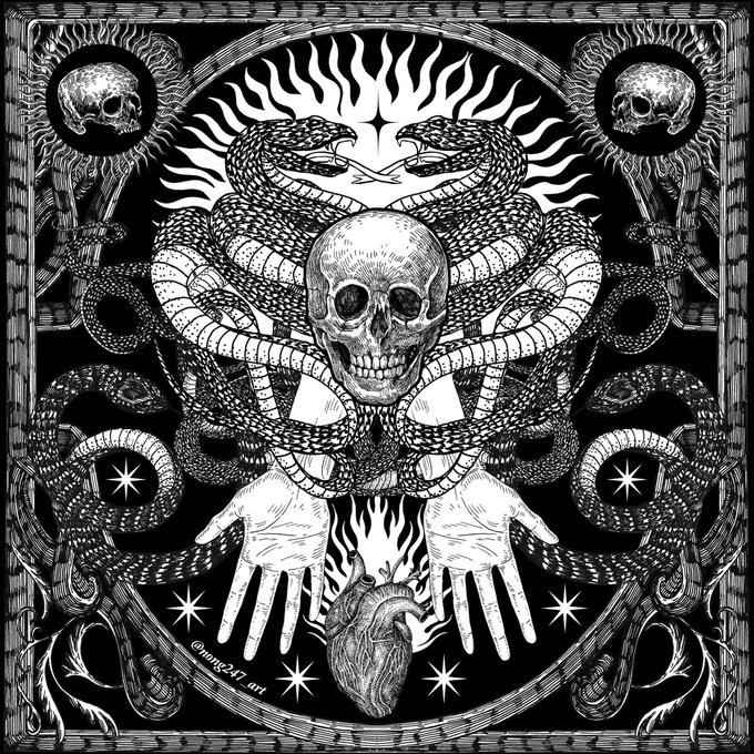 해골과 뱀과 열쇠의 조합을 보고 싶었습니다. 여담이지만 가끔 그림 그리는 것보다 캡션 텍스트 작성하는게 훨씬 더 어려운 것 같아요💀 #illustlation #illustrationart #ArtistOnTwitter #artwork #darkart #occult #snakes #illustrations