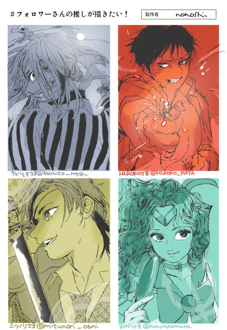 #フォロワーさんの推しが描きたい 伊黒小芭内 ロイ・マスタング 燭台切光忠 海王みちる(セーラーネプチューン) みんな戦う少年中年少女だ!リクエスト頂きありがとうございました~!🙇♀️🙇♀️ @karinto_mtsh @HIROKO_KATA @mitunori_obni @honyaramura