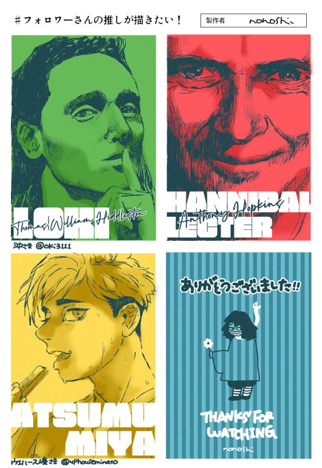 #フォロワーさんの推しが描きたい 最後です! ロキ(トム・ヒドルストン) 宮侑 枠が余ったので私の推し、レクター博士を…😇😇多分ファンサのロキ様!👀👀ロキ様がリアルだったので仲間を!と思い博士を描きましたが、苦手な方はすみません💦💦 @oki3111 @uphouseminato