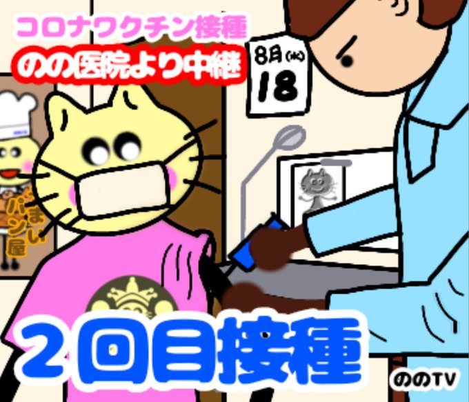 ツイートし直しました。すみません😣💦⤵️ ののにゃんコロナワクチンを接種しているTV中継のイラストです! 他にポスター、Tシャツ、レントゲンの写真にもののにゃんがいます😄 #イラスト #イラスト好きさんと繋がりたい #ゆるいイラスト #絵 #絵描きさんと繋がりたい #ネコ #コロナワクチン
