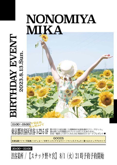 8/13 🌻野々宮ミカバースデーイベント詳細🌻 なんと入場無料🆓です💛 応援して下さってる皆様、お世話になっている皆様へ感謝をお伝えしたいので是非感謝されにフラッと遊びに来ていただけたらと思います✨ t.livepocket.jp/e/nonomikabar_… 日時 8/13 11:00〜19:00 場所 渋谷駅徒歩4分 入場無料… twitter.com/i/web/status/1…